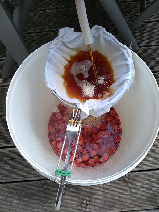 Ich hab die Erdbeeren in einen Baumwollsack getan ( von der Obsttheke im Supermarkt) und 10 min im Dampfgarer entsaftet. Der ausgetretene Saft und den Sack habe ich in die heisse Würze getan. Nach 24 Stunden wurde der Sack entfernt - die Erdbeeren darin waren geschmack- und farblos. Dann kam die Hefe dazu. Ich denke so ist es sehr steril, jetzt warte ich aufs Ergebnis.