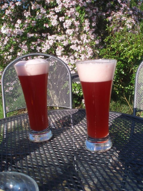 Nach abgeschlossener Hauptgärung wurde der Sud aufgeteilt: jeweils 8 Liter wurden mit 1 kg Himbeeren und 1,2 kg Kirschen gestopft. Das ganze durfte so nochmal 10 Tage stehen bleiben. Vor dem Abfüllen hab ich durch ein Küchensieb filtriert, sind allerdings einige Stückchen durchgegangen...Das Ergebnis ist Geschmackssache: vielen Leuten hat es sehr gut geschmeckt, ich persönlich mag es nicht so. Eines muss man sich klar machen: es wird auf jeden Fall sauer und hat mit Bier nur noch wenig zu tun.